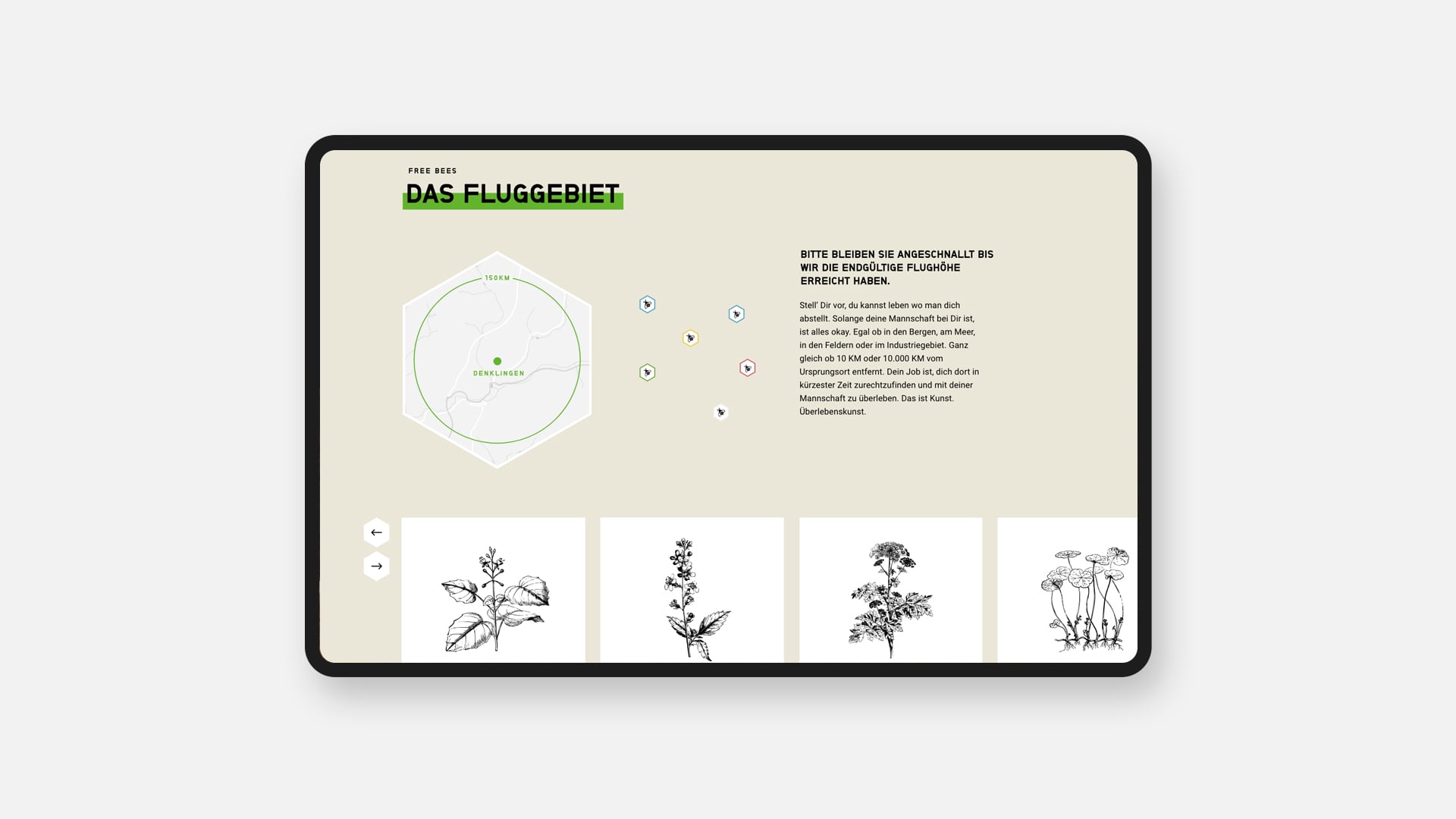 Die Website ermöglicht es den Nutzern, den Produktionsprozess sowie das Fluggebiet und die emsige Arbeit der Bienen in mehreren Schritten zu entdecken. Jeder Scroll zeigt eine neue Facette der Welt der Bienen und erzählt lebendig die Geschichte von Honig und Bienen.